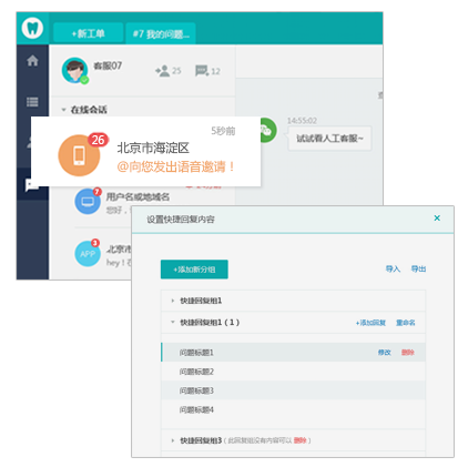 通過人工客服工作臺自定義的快捷回復(fù)內(nèi)容,客服可以一鍵推送內(nèi)容給客戶,清晰的會話提示、超時提醒、未讀消息等,使得企業(yè)客服能一目了然的掌握服務(wù)動態(tài),并以 快的速度響應(yīng)用戶。