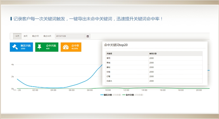 微盟后臺(tái)可以實(shí)時(shí)統(tǒng)計(jì)微信公眾號(hào)的粉絲關(guān)注情況和用戶語(yǔ)音請(qǐng)求數(shù),根據(jù)統(tǒng)計(jì)對(duì)相關(guān)推廣營(yíng)銷活動(dòng)效果及某些敏感因素對(duì)您的影響作出判斷,并對(duì)相關(guān)市場(chǎng)行為作出相應(yīng)調(diào)整,從一定程度上實(shí)現(xiàn)了對(duì)市場(chǎng)的監(jiān)控與及時(shí)應(yīng)對(duì)。
