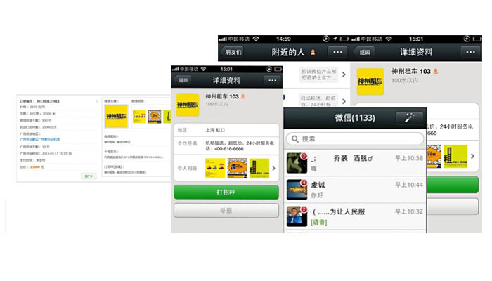 Location Surround Push(基于附近的人的消息推送)微信中基于LBS(基于位置的服務(wù))的功能插件“查看附近的人”便可以使更多陌生人看到這種強(qiáng)制性廣告。 用戶點(diǎn)擊“查看附近的人”后,可以根據(jù)自己的地理位置查找到周圍的微信用戶。在這些附近的微信用戶中,除了顯示用戶姓名等基本信息外,還會(huì)顯示用戶簽名檔的內(nèi)容。所以用戶可以利用這個(gè)免費(fèi)的廣告位為自己的產(chǎn)品打廣告。 營(yíng)銷人員在人流最旺盛的地方后臺(tái)24小時(shí)運(yùn)行微信,如果“查看附近的人”使用者足夠多,這個(gè)廣告效果也會(huì)不斷隨著微信用戶數(shù)量的上升,可能這個(gè)簡(jiǎn)單的簽名欄也會(huì)變成會(huì)移動(dòng)的“黃金廣告位”。