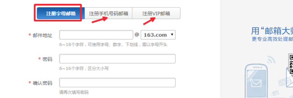 3、點(diǎn)擊后進(jìn)入網(wǎng)易郵箱注冊頁面,其中有注冊字母郵箱、注冊手機(jī)號碼郵箱、以及VIP郵箱,我們可以根據(jù)需要任選其一,例如注冊字母郵箱;