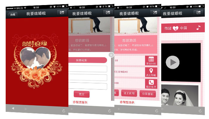 微喜帖是針對(duì)結(jié)婚慶典而推出的一款行業(yè)產(chǎn)品,主要是為計(jì)劃結(jié)婚的用戶們,通過使用微喜帖應(yīng)用來向親朋好友傳播自己即將結(jié)婚的動(dòng)態(tài),可以展現(xiàn)用戶想要表達(dá)的話、結(jié)婚日期、地址、導(dǎo)航、接待電話,同時(shí)親朋好友可以在微喜帖平臺(tái)上提交赴宴通知、送上祝福,并且轉(zhuǎn)發(fā)喜帖。